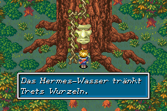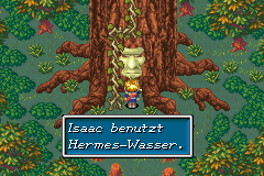 Sobald du hinter die eigentliche Barrikade gelangst, siehst du, dass die Bäume umgefallen sind und nun überall liegen. Ein Baum ist sogar im Wasser - das waren Saturos und Menardi, wie man aus den Gedanken der Bäume lesen kann, doch jetzt musst du den Baum, der im Wasser liegt, retten! Wenn du es nicht tust, wird dieser von der Strömung mitgerissen. Stelle dich neben den Baum und ziehe ihn mit Verschieber zu dir her. Isaac wird den Rest erledigen, der Baum ist nun in Sicherheit und du kannst weiter in den Wald von Kolima. Gehe auf dem selben Weg wie in Kapitel 6 bis ganz nach hinten zu Tret und Arborandra. Sprich Tret an, wähle dann bei den Items das Hermes-Wasser aus und benutze es! Dadurch, dass Tret wieder zu Kräften kommt, erholt sich auch der Wald und er ist nicht mehr so düster.