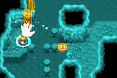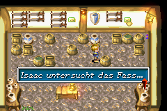 Wie du siehst ist in diesem Raum alles voller Wasser, weshalb du eigentlich nichts machen kannst, als wieder in den nächsten Raum zu gehen. Hier triffst du auf zwei Säulen, mit Feuer darin. Du musst die falsch platzierte Säule auf den Schalter am Boden stellen, damit das Tor aufgeht und du weiter kannst. Im nächsten Raum wirst du oft die Psynergy Frost einsetzen müssen. Erst aber bläst du mit Ivans Wirbelwind die Blätter von der Wand und holst dir den Nimbus aus der Truhe dahinter, den du Garet anlegen kannst. Laufe wieder hinaus und klettere die Leiter in das Becken und benutze Frost an allen Wasserpfützen ausgenommen der ganz rechten. Springe im Anschluss auf die andere Seite und begib dich in den nächsten Raum.