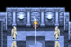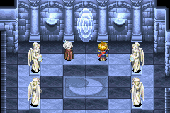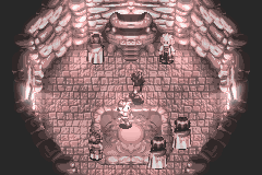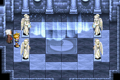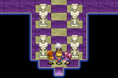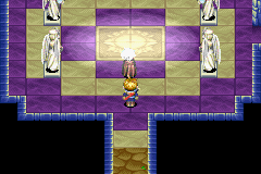 Hinweis: Du kannst das linke Bild hier ändern, indem du mit der Maus darüber fährst!Du gelangst in einen anders aussehenden Raum, Kraden ist verwundert und bittet dich, nach weiteren Wegen zu suchen. Kein Problem, denn mit deiner Psynergy (oder der Körperkraft) kannst du dir hier einen neuen, weiteren Weg verschaffen. Rechts und links sind jeweils weiße Statuen an der Wand. Ganz außen sind jeweils drei Felder jedoch mit einer weißen, gepunkteten Linie umlegt. Das bedeutet, dass du hier etwas bewegen kannst! Gehe nach rechts, denn links wirst du eine Sackgasse finden. Setze dort Verschieber ein, um die Statue beiseite zu schieben oder drücke selbst mit dem Steuerkreuz, wenn du an der Statue stehst steht, dagegen. Sobald die Statue aus dem Weg ist, kannst du durch die Tür. Geh weiter hinein, und schon bist du wieder im nächsten Raum. Eine Wegentscheidung, welcher wäre wohl geschickter? Hier ist es jedoch egal, denn beide führen zum selben Punkt, wenn du rechts gehst, ist es lediglich kürzer.