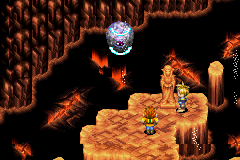 Der Alte Weise kommt zu den beiden und spricht mit ihnen. Sie sollten schleunigst verschwinden. Viele kleine Punkte der jeweiligen Elemente verlassen die Statue und zerstreuen sich. Es sind die Dschinns der Elemente. Der Alte Weise warnt von der Gefahr des Vulkans, der ohne die Macht der Elementar-Steine ungehindert ausbrechen kann. Er redet von der Bedrohung der Alchemie, durch den Missbrauch dieser Macht, doch dann scheint der Vulkan endgültig auszubrechen. Der Alte Weise teleportiert die beiden in den Raum von Sol, sie müssen so schnell wie möglich aus dem Heiligtum fliehen!Nun musst du den Weg schnellstmöglich wieder rückwärts zurücklegen. Alternativ kannst du Rückzug einsetzen oder folgendermaßen zurückkommen: Gehe nach unten, kurz links und wieder nach unten. Springe über den Vorsprung und verlasse den Raum. Gehe dann den Weg entlang und geradewegs nach unten.