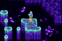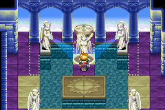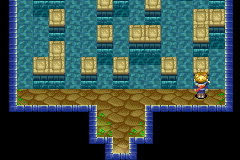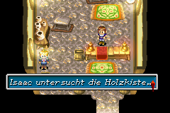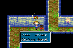 Es folgt jedoch gleich darauf eine weitere Weggabelung. Gehe nach links, am Ende wirst du eine Schatztruhe mit einem weiteren kleinen Juwel vorfinden. Dieses wird, wie du dir denken kannst, bald zum Einsatz kommen, also gehe den Weg wieder zurück und laufe nach oben durch den mittleren Gang, denn auch hier führt der rechte Weg zum gleichen Ziel, man muss nur weiter laufen. Gleich kommt dann eine weiter Biegung nach links und am Ende dieses Weges wartet wieder eine Tür. Du kommst in einen kleinen Raum mit vielen Statuen auf der andren Seite eines Gewässers. Diesmal kannst du nicht selbst schieben, und jetzt? Genau - du musst Psynergy einsetzen. Geh zuerst ganz nach links und stelle dich auf die kleinen Vorsprünge direkt gegenüber der Statuen. Drücke nun A oder Select und wähle den Menüpunkt "Psnyergy".