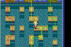 Hinweis: Du kannst das linke Bild hier ändern, indem du mit der Maus darüber fährst!Du kommst nun in das Heiligtum von Sol und musst dich weiter nach vorne kämpfen, doch schon bald kommt das erste kleine Hindernis, welches du im wahrsten Sinne des Wortes überspringen musst. Wie auf dem gezeigten Bild musst du nun über die Plattformen springen. Das geht, indem du einfach das Steuerkreuz in diese Richtung drückst und nicht mehr als ein Feld "leeren Raumes" zwischen dir und der zu erreichenden Plattform frei liegt. Beginne ganz rechts, springe (immer so weit wie es geht) dann oben nach links und wieder ein Stückchen runter, nochmal nach links, wieder hoch und letzendlich nach rechts oben und du bist auf der andren Seite. Jetzt herrscht Vorsicht, denn ab dem nächsten Bereich wirst du erstmals wieder in Kämpfe verwickelt. Geh dort ein bisschen hin und her und trainiere, also besiege die Monster um Erfahrungspunkte zu erhalten, die dich im Level steigen lassen. Es ist empfehlenswert, innerhalb des gesamten Heiligtums um etwa zwei bis drei Level zu steigen. Im nächsten Raum ist wieder etwas Köpfchen gefragt und die Springerei geht wieder los. Geh den im Bild gelb gekennzeichneten Weg als Erstes. Er führt dich zum mittleren der drei Wege. Gehe ans Ende des Ganges und öffne die Schatztruhe. Du erhälst ein Kleines Juwel, womit du jetzt noch nichts anfangen kannst, es wird jedoch gleich wichtig! Gehe zurück, springend, wie du dort hin gekommen bist, jedoch musst du nun den grünen Weg nehmen (eingezeichnet). Du kannst nahtlos in der Mitte der Springplattformen einfach weiter nach rechts gehen um dorthin zu gelangen. An der Wand hängt ein Relief eines Minotaurus. Das rechte Auge funkelt, jedoch musst du in das leere Loch des linken Auges das eben erhaltene Kleine Juwel einbringen. Das Menü schlägt schon von alleine auf, gehe also nur noch auf ITEM und wähle das Kleine Juwel aus. Drücke auf Ben., damit Isaac es einsetzt. Etwas aus Stein hat sich nun bewegt! Es ist eine Tür, nun kannst du zurückhüpfen und über den linken, roten Weg springen. Dort siehst du schon die Tür in den nächsten Raum.