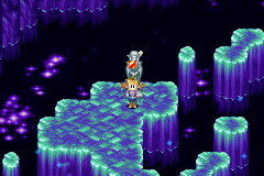 Gehe wieder zurück zur Plattform und nimm den Weg zum Merkur-Stern, rechts oben, denn nur so kommst du außenrum zum Mars-Stern. Du erreichst die Mars-Statue nach dem langen Weg über die Blöcke, die aus dem Wasser stehen, beachte jedoch, bei der letzten Biegung nach unten zu springen und nicht weiter nach links, denn nur so kommst du zum Stern. Kurz bevor du den Mars-Stern nimmst, speichere wieder, denn auch nun folgt eine noch längere Textsequenz.![]() Gerade willst du dich auf den Weg zu den Bösewichten, die deine Freunde festhalten, machen, da kracht und bebt es plötzlich im gesamten Raum. Das gesamte Wasser ist verschwunden und tiefe Risse sind im Boden. Mitten im Raum schwebt plötzlich ein Stein mit einem Auge. Es ist der Alte Weise, der Wächter der Elementar-Sterne. Die Gruppe entschließt sich zu fliehen und den Mars-Stern nicht noch zu holen. Sie nehmen Jenna und Kraden mit, Isaac und Garet bleiben alleine mit dem Mars-Stern übrig.