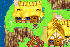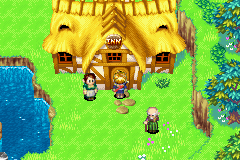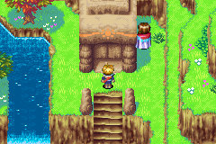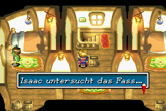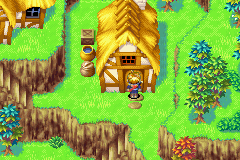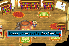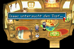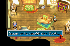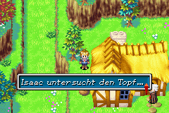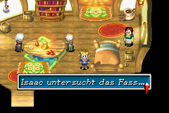 ![]() ![]() Es geht weiter - nachdem du diesen Kampf nun verloren hast, folgt eine längere Sequenz. Jenna läuft in Vale entlang und kommt an Isaacs Haus vorbei, der gerade das Dach mit Instruktionen seiner Mutter repariert. Sie läuft weiter nach oben und schaut Garet beim Training zu. Dieser will seine Fähigkeiten im Umgang mit Psynergy verbessern, damit etwas wie vor drei Jahren nicht wieder passieren kann. Nach kurzem Plausch gehen die beiden zusammen zu Isaac, denn sie haben vor, heute mit Kraden ins Heiligtum von Sol, das Innere des Aleph-Berges, zu gehen - im Sinne ihres Alchemiestudiums. Auch Isaac übt ständig mit seiner Psynergy, wie du nun sehen kannst. Ohne diese Kraft, die sie nun beherrschen wäre es sicherlich schwerer, das Dach zu reparieren. Kurz darauf geht es auch schon los und ihr müsst zu Kraden. Bevor du Kraden suchen gehst, kannst du jedoch noch ein paar kleine Schätze finden! ![]() Wenn du den direkten Weg nehmen willst, dann geh von deinem Haus aus nach Norden und über die Brücke beim Wasserfall. Geh das kleine Stückchen runter und nach links, um in den nächsten Abschnitt zu gelangen. Dort triffst du jedoch erst zwei dir bekannte Personen. Der Mann und die Frau, die dich vor drei Jahren besiegt haben - Saturos und Menardi - versperren dir den Weg. Nach kurzem Plot kannst du jedoch weiter und du gehst nach links, gleich die erste Treppe hoch und schon bist du bei Kradens Haus, in dessen Umgebung du dir zwei weitere Schätze holen kannst. Dieser ist sichtlich beunruhigt, da die beiden Fremden kurz zuvor bei ihm waren und auch mit ihm geredet haben. Doch nun ist das Alchemiestudium wichtiger!