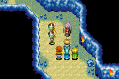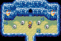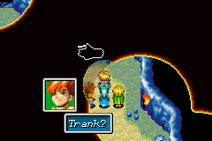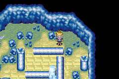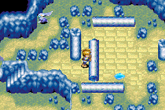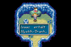Das war der erste Streich, doch der zweite folgt zugleich. Laufe nach unten an der Pfütze vorbei und rolle die Säule nach oben. Nun musst du die Pfütze zur Frostsäule erstarren lassen. Das geht mit Mias Psynergy Frost. Laufe jetzt weiter nach oben und zwar solange, bis du von der zuvor gerollten Stange aufgehalten wirst. Jetzt gehst du nach links und kommst somit wieder hinter diese Säule, die du dann wieder nach unten rollst. Gehe unterhalb der Frostsäule entlang auf die rechte Seite und rolle die Säule, die du als erstes gerollt hast, wieder nach links. Diese wird, wie die davor an der Frostsäule stehen bleiben. Ein letztes Stück nach oben noch und du kannst die noch unberührte Säule nach unten rollen, um zum Dschinn zu gelangen. Speichere hier ab, denn du wirst von dem Jupiter-Dschinn in einen Kampf verwickelt. Danach erhälst du 295 Erfahrungspunkte, 352 Münzen und den Dschinn Mistral. Gib ihn an Ivan weiter und speichere erneut ab. Laufe nach dieser kleinen Zwischenlage wieder nach rechts zurück bis hin zu der stehenden Steinsäule, welche du nach rechts schiebst um auf die andere Seite zu gelangen. Springe also rüber und nimm die Treppe nach unten ... und somit zurück in die Dunkelheit.