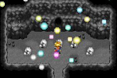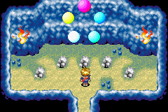 Ein weiter Raum, der im Licht erstrahlt! Das war sogar die letzte Treppe nach unten, denn du bist nun unten angelangt. Laufe die Stufen nach unten und lass dich von den Rohren auf dem Boden gar nicht stören. Geh nach unten und laufe über die Stufen rings herum bis du auf der anderen Seite ankommst und dich nach unten fallen lassen kannst. Nun geht es in den nächsten Raum. Du bist endlich in besagtem Stein-Raum, in welchem du die Farben zuordnen musst. Erinnere dich, was dir gesagt wurde. Zuerst musst du den linken und dann den rechten Stein drehen (mit A) und die Farben erscheinen. Nun hast du zwei Möglichkeiten: Entweder du erinnerst dich an die Farbenfolge oder liest sie oben nach, oder du machst ganz einfach Enthüllung und du kannst die Farben sehen! Wähle die gewünschten Farben und du kannst den Trank holen!