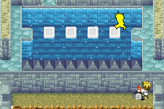 Die allerletzte Hürde, die zu überwinden ist hat keinen Namen, allerdings geht es wieder um einen Baumstamm, der in ein Wasserbecken gerollt werden muss, nachdem der Weg freigeräumt ist. Hier könnte in der Schummelpause niemand etwas tun. Laufe nun zurück nach links, setze noch alle Venus-Dschinns auf Standby und speichere ab, bevor du dann in die Schummelpause übergehst, indem du wie zuvor mit dem Soldaten am Eingang sprichst.