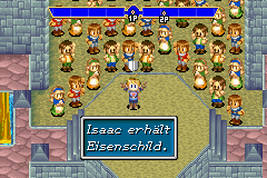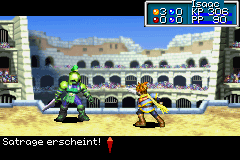 Es wird wohl noch eine kurze Zeit dauern, bis dein Gegner mit seinem Weg fertig ist und in den Ring steigt. Wenn es dann soweit ist, kannst du dich mit Granit etwas schützen. Nun beschwörst du wieder Gericht. Wenn du Glück hast, wird er nur eine Rauchbombe auf dich werfen. Greife nun mit Knopse an, um wieder volle Energie zu erhalten. Mit Ragnarök und danach Strato wirst du dem Ende des Kampfes näher kommen. Sofern es nicht wirklich nötig ist, verschwende keine Zeit damit, dich zu heilen, sondern greife wieder mit Kiesel oder einer Psynergie an. Der Kampf sollte damit gegessen sein, ansonsten dauert es sicher nicht mehr lange. Somit hast du auch die zweite Finalrunde erfolgreich hinter dich gebracht und nur noch eine weitere liegt vor dir. Die Wachen sind ganz begeistert von deiner Leistung und bereuen ihre Vorurteile. Doch es gibt keine Zeit zu verlieren, der letzte Schauplatz wartet schon, ausgekundschaftet zu werden. Speichere nun aber erstmal wieder ab!