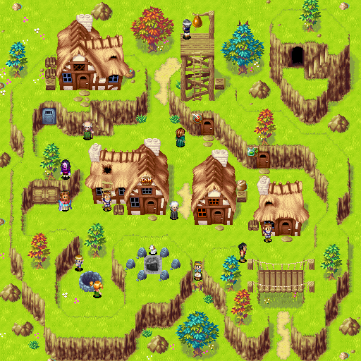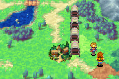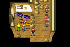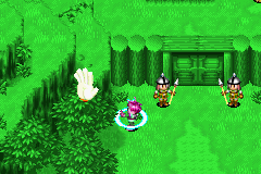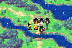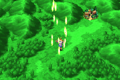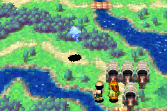 Hinweis: Du kannst das rechte Bild hier ändern, indem du mit der Maus darüber fährst!Ausgesetzt auf der Weltkarte, hast du nun viele Möglichkeiten, dein Abenteuer zu bestimmen. Nicht weit und ein Dschinn, ein Elementargeist, wartet schon darauf von einem starken Adept wie dir mitgenommen zu werden. Lies dir genau durch, was er zu sagen hat, denn das ist sehr wichtig. Dschinns sind bedeutend für den Kampf und für andere nützliche Attribute. Mit Dschinns kann man mehr anstellen, als man erst denkt. Wenn er sich mit dir verbündet hat, dann gehe ein bisschen auf der Weltkarte umher und trainiere vielleicht etwas, doch schon bald geht es in der Story weiter. Gleich bevor es in die nächste Stadt geht, könntest du dir einen Schatz holen. ![]() Wenn du dich deiner Meinung nach genug auf der Weltkarte umgesehen hast, dann gehst du nach Vault, ein kleines Dorf, welches du ganz einfach erreichst, wenn du von Vale über die Weltkarte über eine Brücke ein Stückchen nach unten gehst. Kurz bevor du eintreten kannst startet eine kleine Sequenz. Eine Horde von Kutschen fährt hinaus und in den Süden. Die Insassen wollen in eine Stadt namens Kalay, doch die Brücke ist zerstört und so können sie nicht dort hin. Da der Aleph-Berg immernoch Psynergysteine spuckt und der Besitzer der Kutschen, Meister Hammet, Angst bekommt, gehen sie nach Norden, in die Diebesstadt Lunpa. Isaac und Garet denken sich nicht viel dabei und du betrittst letztendlich Vault.