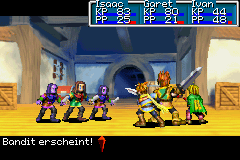 Kampf-Strategie: Der Kampf beginnt und sofern du Kiesel nicht schon auf Standby hast, setze ihn auf den Bandit ein. Garet sollte Feuer und Ivan Blitzstrahl einsetzen. Am besten wäre es, wenn die drei Charaktere mindestens auf Level 4 wären. In der nächsten Runde das gleiche Spiel, nur sollte Isaac nun Venus beschwören, denn der Dschinn ist bereit zum wirklichen Einsatz. Im Normalfall sollten die zwei Diebe, die rechts und links stehen, schon den Kampf verloren haben. Benutzt nun mit allen drei trotzdem Erdbeben, Feuer und Blitzstrahl, mit Hauptziel wie vorher auch den Bandit. Das sollte genügen, damit auch der Bandit diese Runde nicht übersteht und so erhälst du nach erfolgreichem Kampf ganze 66 Erfahrungspunkte, sowie 110 Münzen und das Gauner-Schwert.
