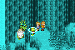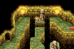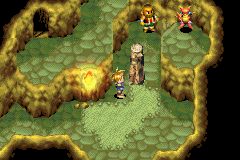 Hinweis: Du kannst das linke Bild hier ändern, indem du mit der Maus darüber fährst!Sobald du weiter nach oben gehst und links entlang läufst, merkst du bald, dass dieses lästige Laub dir nicht erlaubt, den Felsen nach unten zu verschieben und du kannst nicht weiter. Drücke also wieder B, denn mit der Psynergy kannst du nichts ausrichten und sofort kommt auch Garet und meldet sich zu Wort. Gerade in diesem Moment kommt dein neuer Freund Ivan angelaufen, dem du in Vault geholfen hast. Nach kurzer Erklärung, warum er wieder da ist und dass er dir helfen möchte, weil er nichts für seinen Meister Hammet tun kann und du ihm auch geholfen hast, schaut er sich das Problem an und fegt das Efeu um den Stamm mit seiner Psynergy Wirbelwind weg. Er tritt deiner Gruppe bei, denn dein Auftrag interessiert ihn sehr und Meister Hammet kann er leider nicht retten, da er nicht nach Lunpa reinkommt. Ihr beschließt also nun gemeinsame Sache zu machen und du bist wieder an der Reihe. Jetzt kannst du Verschieber einsetzen und auf den Vorsprung gelangen. An der Wand sind jedoch wieder Blätter, die einen Eingang blockieren. Benutze Ivans Wirbelwind-Psynergy wie eben schon bei dem Felsen und schon ist der Weg frei. Ein Eingang erscheint und du kannst endlich ins Innere, in die Höhle hinein!