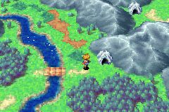 Hinweis: Du kannst das rechte Bild hier ändern, indem du mit der Maus darüber fährst!In diesem neuen Areal gehst du erstmal die ersten Schritte vergnügt und ohne Probleme. Springe über den Fluss mithilfe eines Steines, der im Wasser liegt und schau dich auf der andren Seite um. Dort siehst du wohl eine Leiter, die du jedoch aufgrund des Stammes nicht erreichen kannst. Schiebe ihn nach hinten (nach rechts), damit du die Leiter erklimmen kannst. Ob du nun Psynergy einsetzt oder nicht, ist dir überlassen. Wenn du die Leiter oben bist, wirst du links eine Sackgasse finden, also gehe nach rechts und du siehst einen weiteren versperrten Weg. Jetzt musst du allerdings Psynergy benutzen und den Stamm zu dir her in das Loch ziehen um weiter zu gelangen. Schwupps – und schon ist er aus dem Weg.