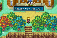 Zurück im Stadtzentrum, wird eben jenes langsam langweilig, weshalb du am besten einfach nach Norden gehst, denn dort gibt es einen weiteren Teil der Stadt. Du gelangst vor den Palast von Lord McCoy. Einige Wachen stehen vor der Tür. Hol dir erst einmal den Schatz, den du hier bekommen kannst. Wie du siehst wird weiter links ein weiterer Palast gebaut. Er soll für Lady McCoy sein, doch die Arbeiten gehen nicht voran, da sie Bäume vom Wald brauchten und jetzt ein Fluch über ihnen liegt. Das ist jetzt jedoch noch unwichtig, also gehe zur Palasttür und sprich den rechten Mann an. Wenn du sagst, dass du es wagen möchtest, den Fluch zu bezwingen, kommst du nach kurzer Zeit in das Innere des Palastes.
