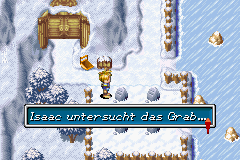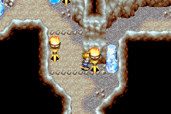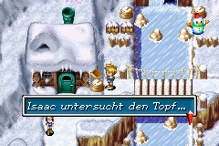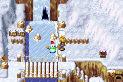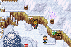 Laufe nach oben und gehe über die Brücke, doch bevor du wieder die Treppe hinunter gehst, gehst du an der Seite hinein. Wenn du genau vor dem Schneemann stehst, benutze "Verschieber" und verschiebe ihn nach links. Somit fällt er auf die Eisfläche. Gehe zurück zu der Stelle, an der du auf das Eis kannst. Wieder gehst du Rechts, Hoch, Links, Hoch, Links, Hoch, Rechts und Hoch. Von hier gehst du nun nochmal Rechts, dann hoch, links, runter, rechts, hoch, rechts wenn du jetzt nochmal hoch klickst, kommst du zum Dschinn. Sprich den Dschinn an und er wird sich dir ohne Kampf anschließen. Nun hast du einen neuen Feuer-Dschinn: Fieber! Speichere zwischendurch und verlasse diese Höhle wieder.