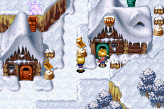 Da die Waffen- und Rüstungshändler krank sind, wirst du dir keine neue Ausrüstung kaufen können, nur der Itemladen hat auf, wo die Tochter ihre Mutter im Geschäft vertritt. Gehe zuerst einmal auf die andre Seite des eingefroren Baches. Von dort gibt es eine weitere Stelle, von der man auf das Gewässer kommt. Rutsche von dort in folgende Richtungen: Rechts, Hoch, Links, Hoch, Links, Hoch, Rechts, Hoch, Links, Runter, Links, Hoch, Rechts! Schon bist du an der richtigen Stelle, an der du zur Schatztruhe kommst und ein Fläschchen erhälst. Klettere die Leiter weiter runter und rutsche links und runter, um wieder wegzukommen.