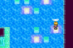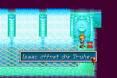 Laufe rechts am Rand entlang und springe auf die andre Seite. Laufe dann den Weg entlang und nach links, bis du auf der andren Seite eine Statue siehst. Diese musst du auf das Symbol am Boden stellen, schiebe sie also den markierten Weg entlang auf die andre Seite. Wie du siehst, öffnet sich dadurch die Tür, durch die du nun gehen kannst. Rutsche rechts die Mulde hinunter um durch den kleinen Tunnel in den nächsten Raum zu gelangen! Auch hier musst du nichts weiter tun, als dich runterfallen zu lassen. Der komische Text, der nun zu lesen ist, ist derselbe, wie auf dem Schild vor diesem Wasserbecken. Hüpfe nach oben zur Statue und setze Mias Psynergy Gebet ein. Wenn du nun zurückspringst, siehst du drei Ringe über deinem Kopf. Das bedeutet, dass du von nun an mit solchen Ringen über Wasser springen kannst und zwar so oft, wie dir diese Ringe zur Verfügung stehen. Hüpfe jetzt also zurück auf den festen Boden nach rechts und gehe wieder in den nächsten Raum.