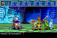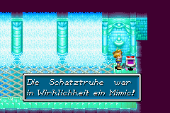 Auf dieser rechten Seite nun springst du auf die leuchtende Plattform und kannst somit durch die drei Schweife auf die andre Seite gelangen. Springe dreimal nach rechts und einmal nach unten und schon kannst du in den nächsten Raum. Du kommst aus dem linken Wasserfall der drei vorhandenen. Gehe zum rechten Wasserfall und gehe hindurch, dort kannst du durch das Überspringen des Wassers die Psy-Rüstung erhalten! Gehe zurück in den Raum zuvor und speichere, denn jetzt kommt ein kleiner Kampf gegen die erste Mimic im Spiel! Setze alle Dschinns auf Standby und drücke A, wenn du vor der Truhe stehst. Der Kampf beginnt sofort und mit Hilfe von Ramses, Kirin, Atalanta und Merkur sowie kräftiger Einsatz von den stärksten Psynergien und gegebenenfalls erneutem Einsatz der Dschinns oder Psynergien sollte der Kampf nicht allzu lange dauern! Du erhälst 164 Erfahrungspunkte, 178 Münzen sowie ein Lebenswasser!