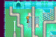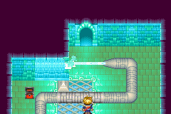 Im nächsten Raum findest du erstaunlicherweise Wasserfälle! Bei manchen kann man sogar hindurch gehen, hier ist das aber nicht der Fall und deshalb kannst du gleich weiter in den nächsten Raum. Nun gilt es ein Röhrenrätsel zu lösen. Gehe in die kleine Lücke und schiebe das Rohr weiter nach rechts, um den Wasserstrahl umzuleiten. Hier kannst du jetzt weiter runter gehen und dich von einem andren Strahl nach rechts drücken lassen. Benutze die Treppenunterführung und lass dich vom nächsten Strahl nach unten schieben. Du kannst weiter nach links, außen um den Strahl herum und wieder Treppen zur andren Seite nehmen. Sobald du ganz außenrum gegangen bist, kannst du das Rohr, welches du eben verschoben hast, wieder zurück schieben! Gehe wieder nach unten, allerdings nicht gleich nach links, sondern noch einmal ein Stück in die andere Richtung, denn dort gibt es noch einen Psy-Kristall. Lauf dann zurück und biege an der Stelle, wo du vorher nach rechts gedrückt wurdest, nach links unten ab. Eine weitere Treppenunterführung bringt dich zum Raumende.