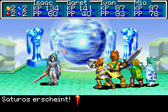 Kampf-Strategie: Mit Level 12 oder 13 sollte der Kampf gut zu meistern sein. Die erste Runde greifst du am besten mit den Zwei-Dschinn-Beschwörungen an! Solltest du Schaden nehmen, heile am besten mit Isaac oder Items, denn die Psynergien von Mia benötigst du hier. Diese sind gegen Saturos sehr effektiv, denn er ist ein Feuer-Adept. Ansonsten, greife mit den stärksten Psynergien an. In der nächsten Runde musst du auf jeden Fall heilen, benutze Items oder Psynergien dafür und aktiviere bei dieser Gelegenheit auch Sprudel, indem du jemanden damit heilst. Ist sonst noch jemand frei, sollte er einen Dschinn benutzen. Nun solltest du Granit einsetzen um deine Gruppe etwas zu schützen. Heile gegebenenfalls weiter und greife weiter mit den Dschinns an. Heile bei Bedarf und greife weiterhin an. Solltest du wieder zwei Dschinns von einem Charakter benutzt haben, verwende die Beschwörung. Setze dieses Prinzip weiter fort und bald solltest du für den Sieg mit 331 Erfahrungspunkten, 800 Münzen und einem Psy-Kristall belohnt werden! Schau auf jeden Fall, dass jeder am Leben ist, wenn der Kampf zu Ende geht, ansonsten versuche es ein weiteres Mal - dafür hast du ja vorher gespeichert!
