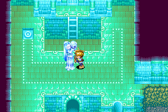 Wieder gibt es andre Statuen zu verschieben. Tu das jedoch nur bei der dritten von links, denn die andren verdecken nur eine leere Wand. Hinter der dritten Statue findest du eine Schatztruhe mit einer Nuss. Gehe nun weiter nach unten und benutze die Leitern um zur Statue auf der andren Seite zu kommen. Verschiebe diese mit der Psynergy zur Seite und betritt den nächsten Raum. Eine weitere, sehr einfache Aufgabe: Rolle das Rohr einfach nach oben und ein neuer Zugang für den nächsten Raum wird sich offenbaren. Dort findest du wieder Wasserfälle. Gehe in den vierten von rechts, setze alle Dschinns auf Standby und speichere ab.