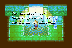Gehe nun aus diesem Bereich links unten hinaus. Nun musst du nur noch dem Weg folgen, denn du kannst hier nicht falsch laufen. Irgendwann kommt ein Raum mit Wasserfällen. Durch den letzten Wasserfall kannst du gehen und hier von rechts eine Statue nach links verschieben. Jetzt musst du wieder nur den Weg entlang gehen und kommst schließlich in einen Raum mit einem Regenbogen. Ein mysteriöser Text ist der Schlüssel zu einem Rätsel. Du musst die Psynergy Gebet auf die Statue rechts anwenden. Zuvor aber setzt du alle Dschinns auf Standby, heile dich mit Psynergy und speichere ab!