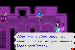Er bittet die beiden, ihn nicht zu reizen, doch einer der beiden macht ständig weiter, bis Aaron schließlich keine andere Wahl hat und die Pfütze unter dem Provozierendem zur Eissäule erstarren lässt. Kraden erkennt es sofort als Psnyergy. Die zwei rennen in Angst raus. Nun hast du die Chance etwas mehr über ihn herauszufinden. Dieser wartet aber nur auf den Ältesten, der hoffentlich seine Gefangenschaft beendet, wenn du jedoch Geistleser einsetzt, wird er das auch bemerken. Aber es hilft nichts, du kannst hier nichts weiter tun, als das Gefängnis wieder zu verlassen. Draußen siehst du die Frau des Bürgermeisters und einige andere Bürger, die sich vergewissern wollen, ob Aaron geflohen und was genau passiert ist. Zudem spricht sie auch dich an, antworte mit Ja, wenn sie wissen will, ob du nach Osenia gehst. Sie wird dir eine Erlaubnis geben, über die Klippen auf den nächsten Kontinent Osenia zu gelangen. Sie verschwindet wieder und du kannst dich frei bewegen.