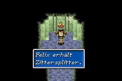Klettere die Leiter hinunter und geh in den nächsten Raum. Dort nimmst du den nächsten Durchgang nach oben, da der untere dich zu einer Stelle führt, wo du jetzt noch nicht weiterkannst. Folge dem Weg nun bis in den nächsten Raum. Klettere dort gleich die erste Ranke, die du siehst, nach oben und laufe weiter nach links, bis du die Steinsäule siehst. Zieh sie zu dir, damit sie nach unten fällt und lauf weiter. Klettere am Ende die Ranke nach unten und betritt das Innere des Gebäudes. Spring dort nach rechts, wo du dann die Treppe nach unten gehst. Geh durch die Tür und du wirst dich in einer Art Schatzkammer befinden. Die sich dort befindende Truhe enthält den Zittersplitter, der eine wichtige Psynergy erlernt - Erdgezitter. Da es eine Erd-Psynergy ist, kannst du den Splitter Felix anlegen. Mehr kannst du vorerst in diesen Katakomben nicht tun, benutze also Rückzug und verlasse nun endlich auch Madra.